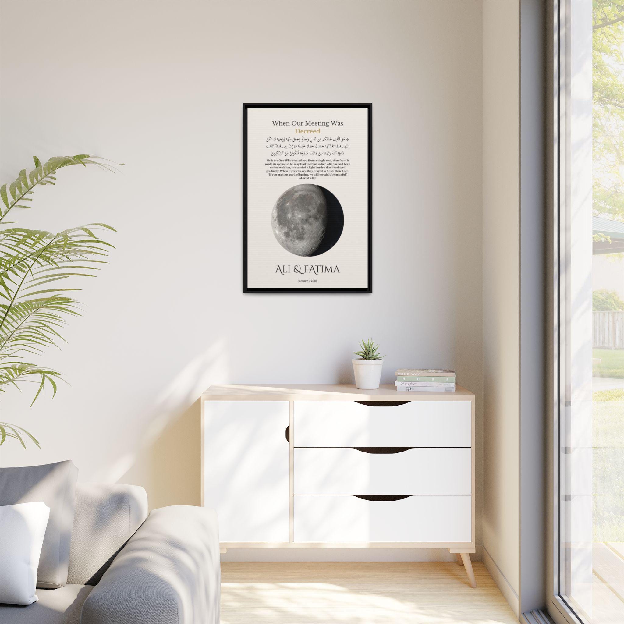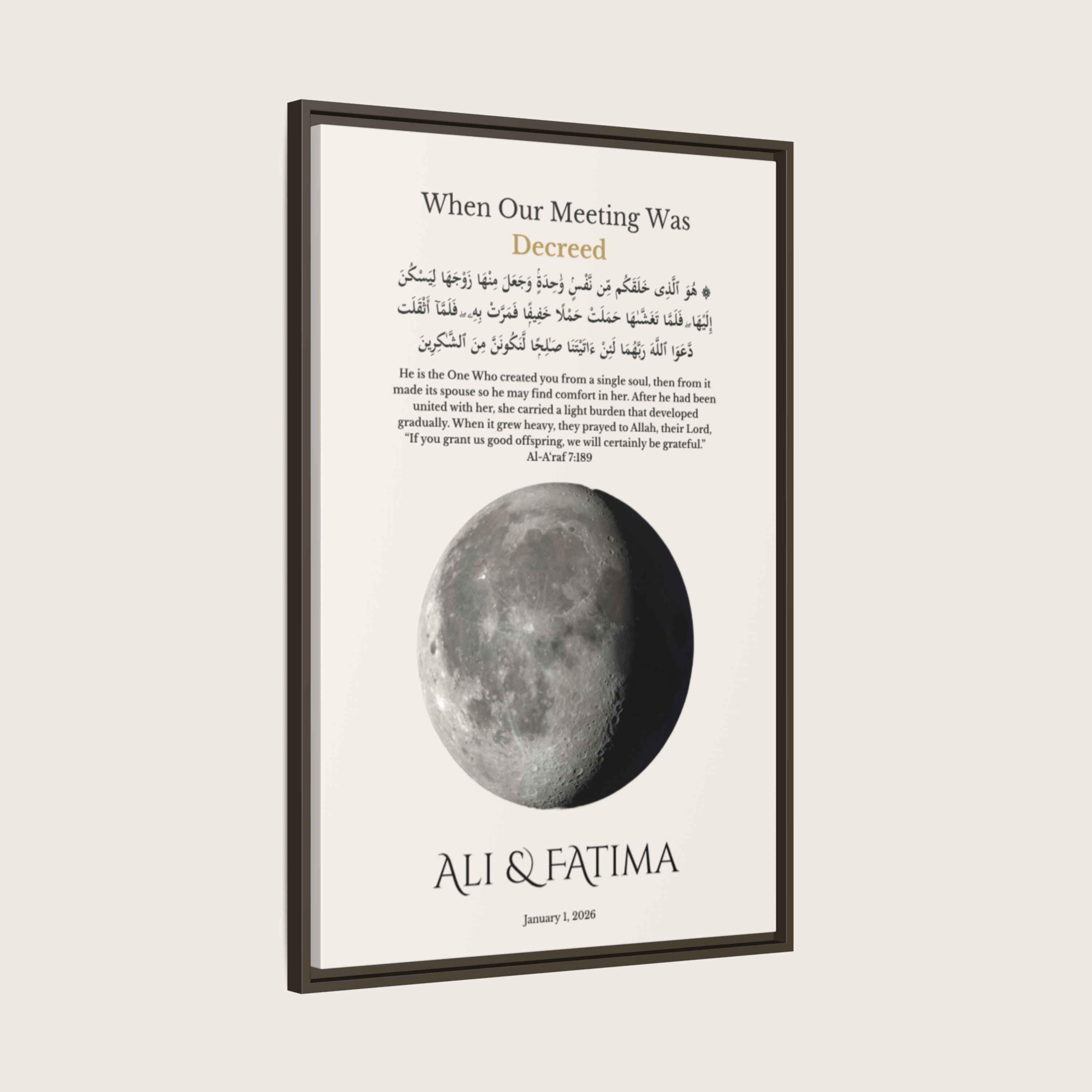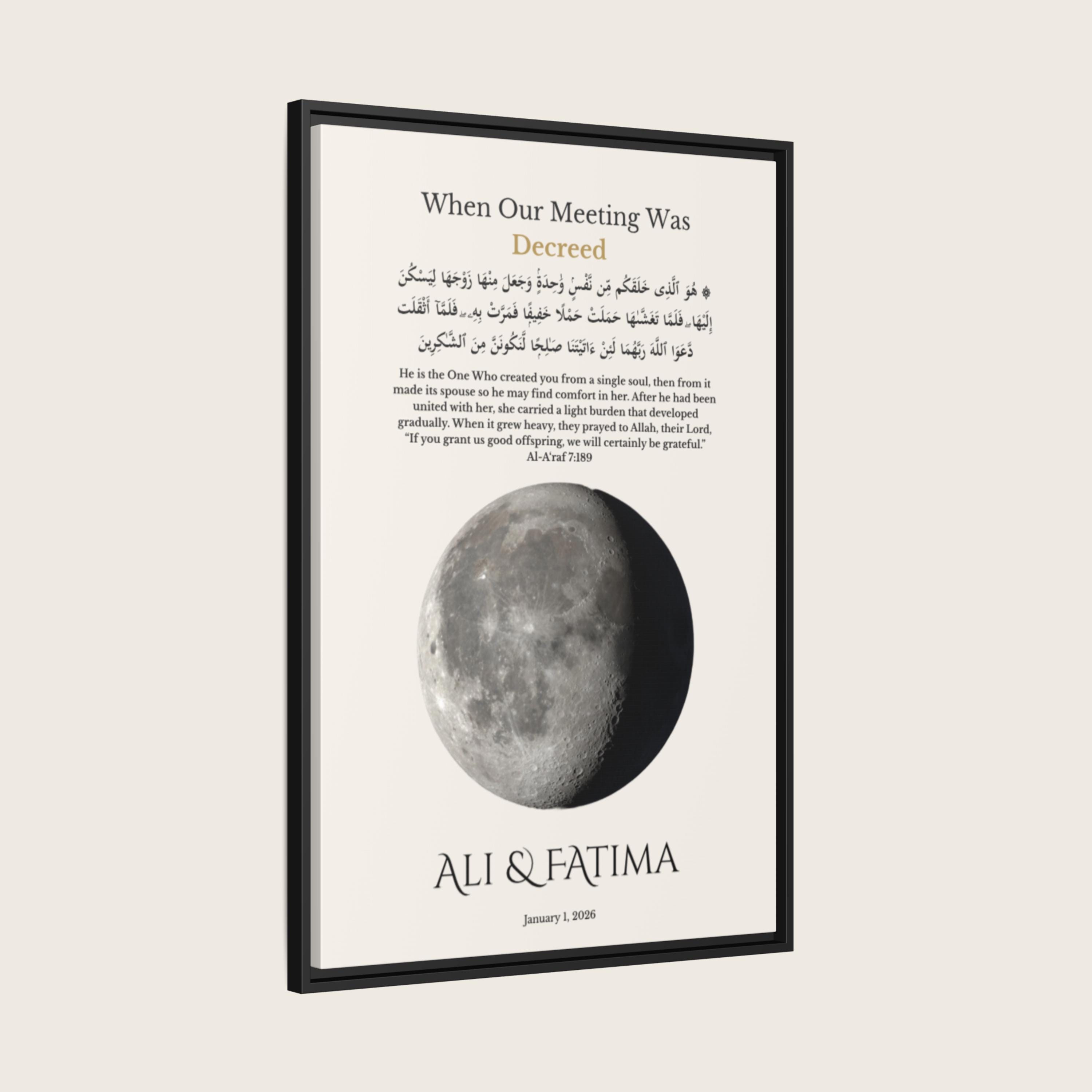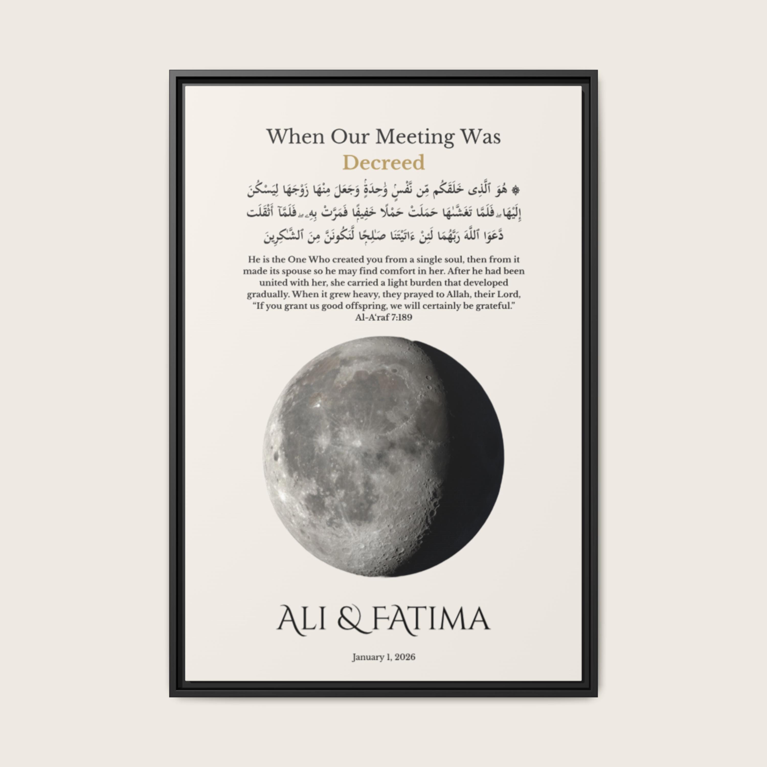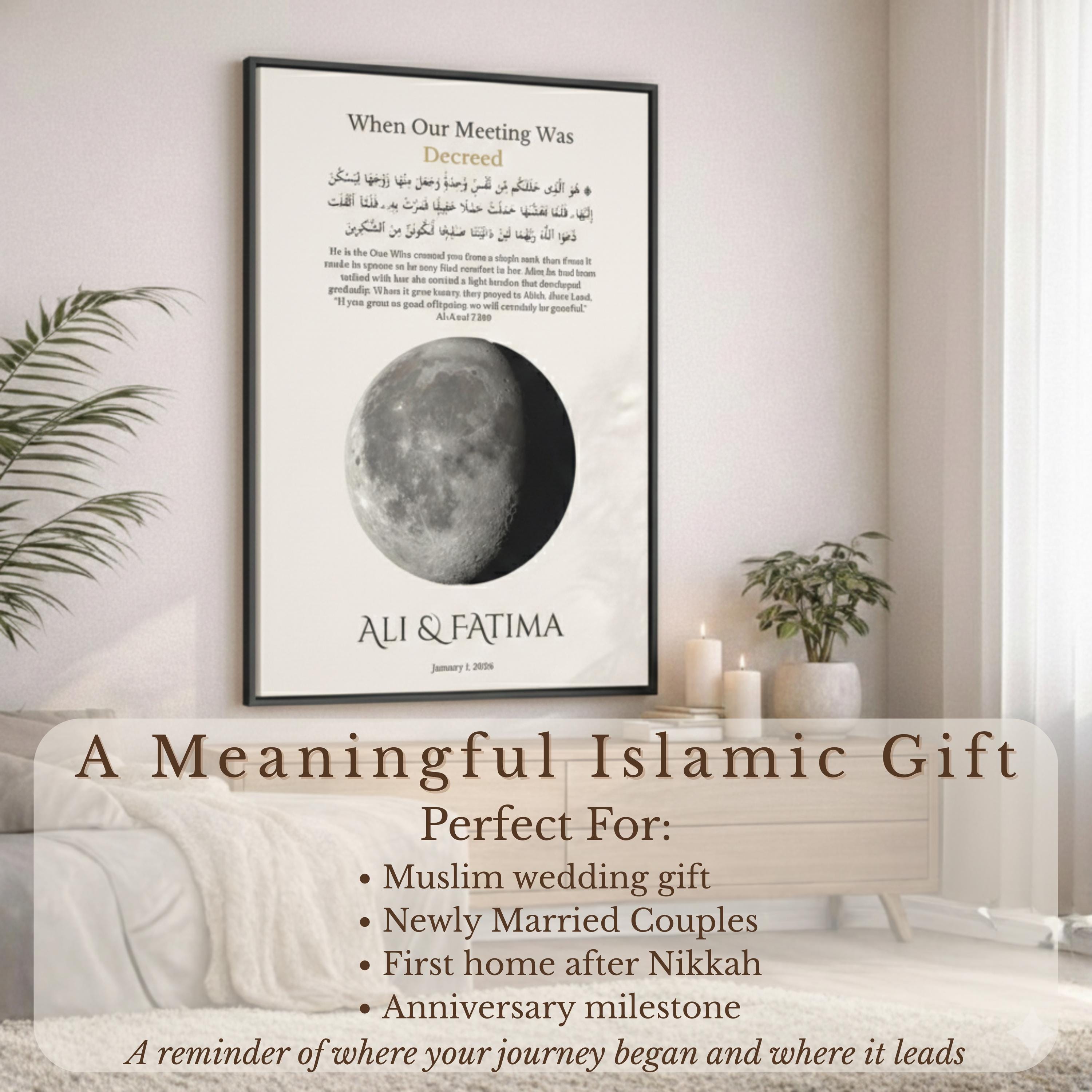 This meaningful wall art is calculated using precise lunar data based on your selected date, reflecting the true moon phase on your first meeting. Personalized with your names and first date, it features a Qur’an verse from Surah Al-A’raf (7:189) in Arabic and English — honoring the belief that your meeting was written long before it happened.