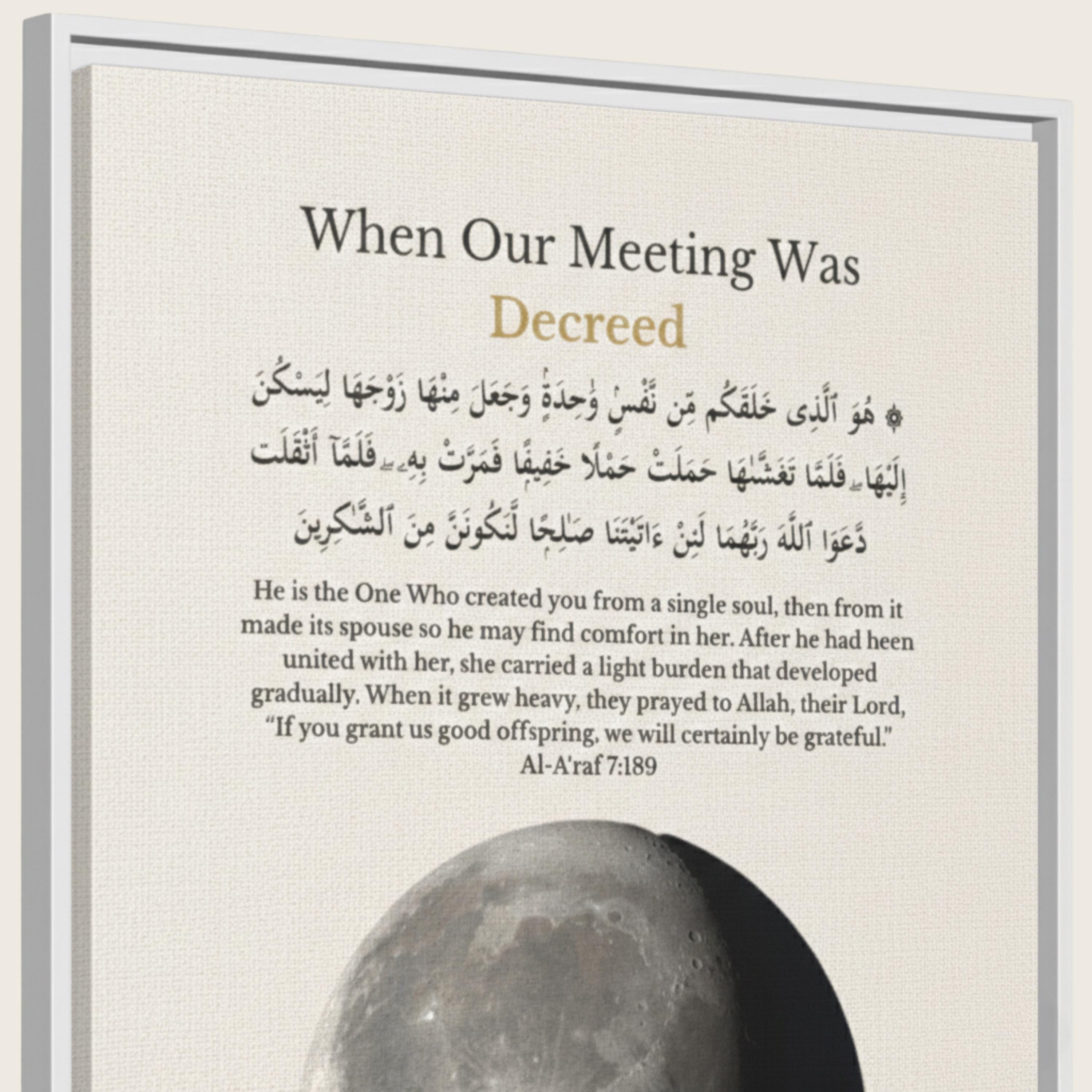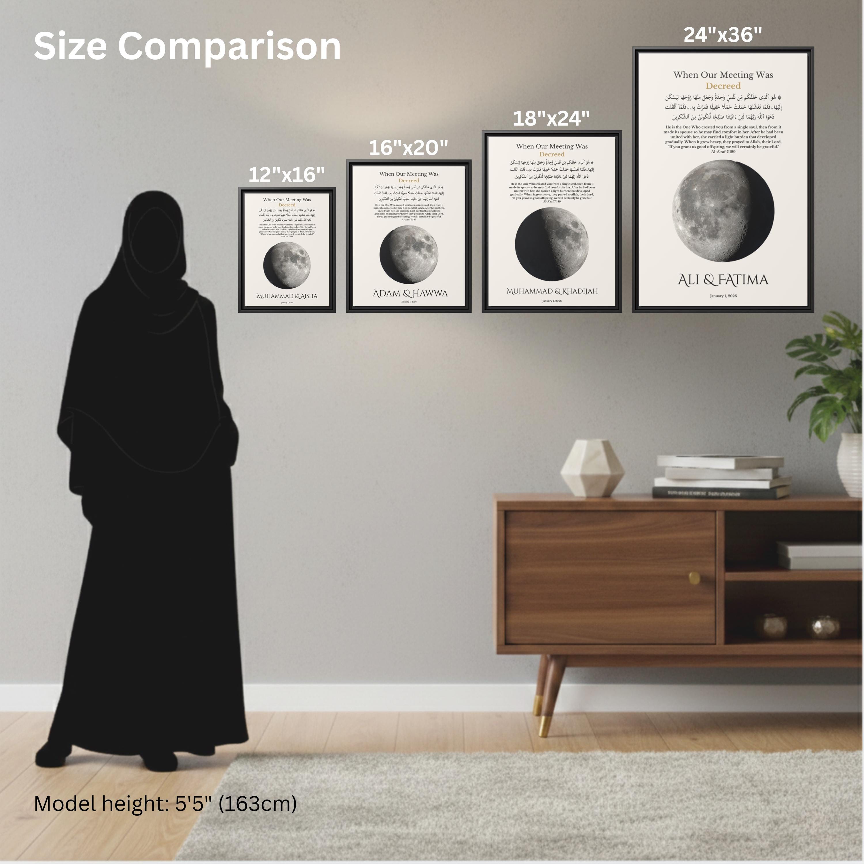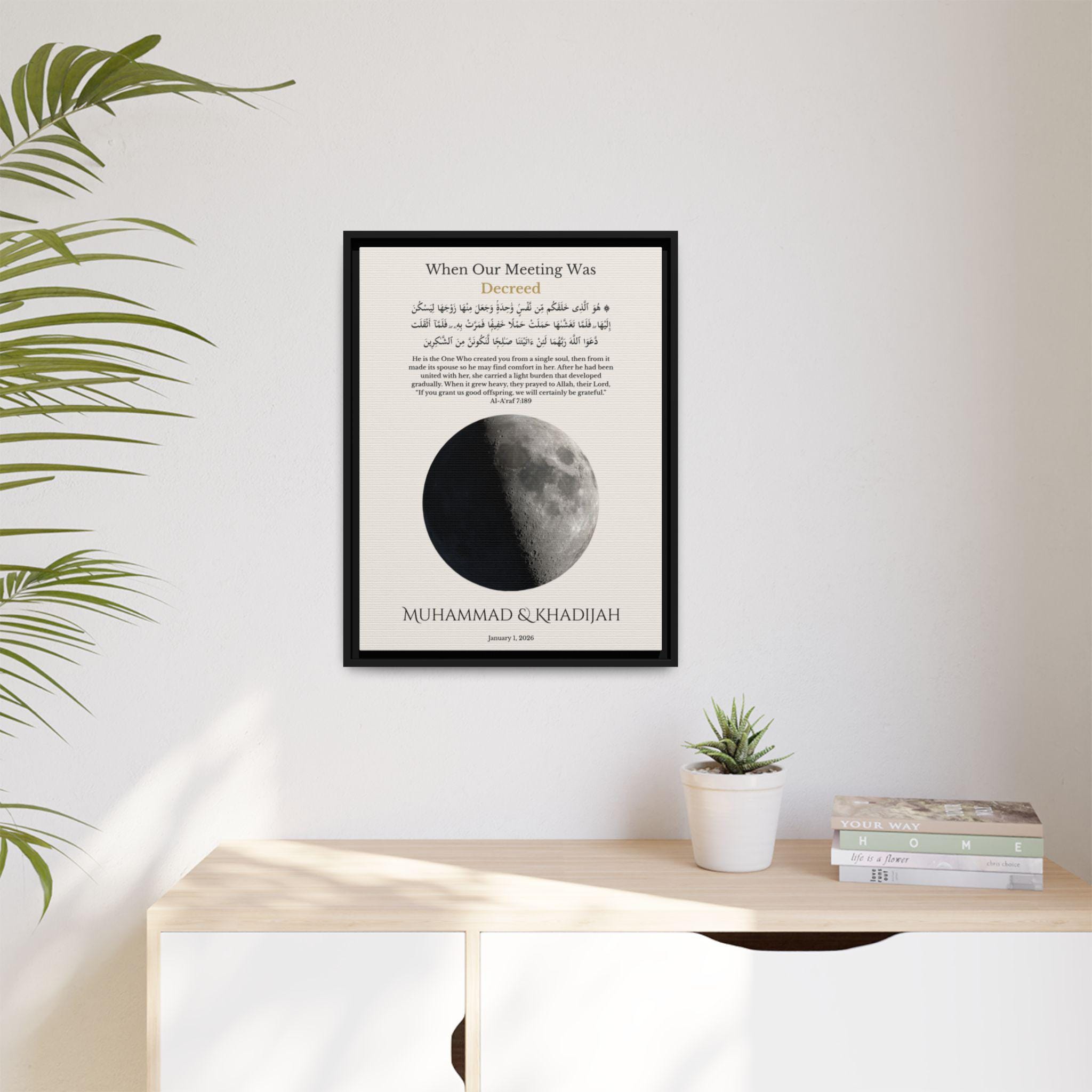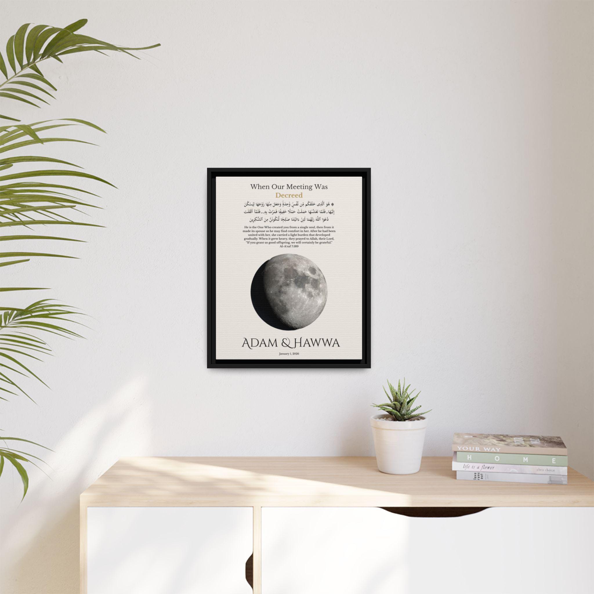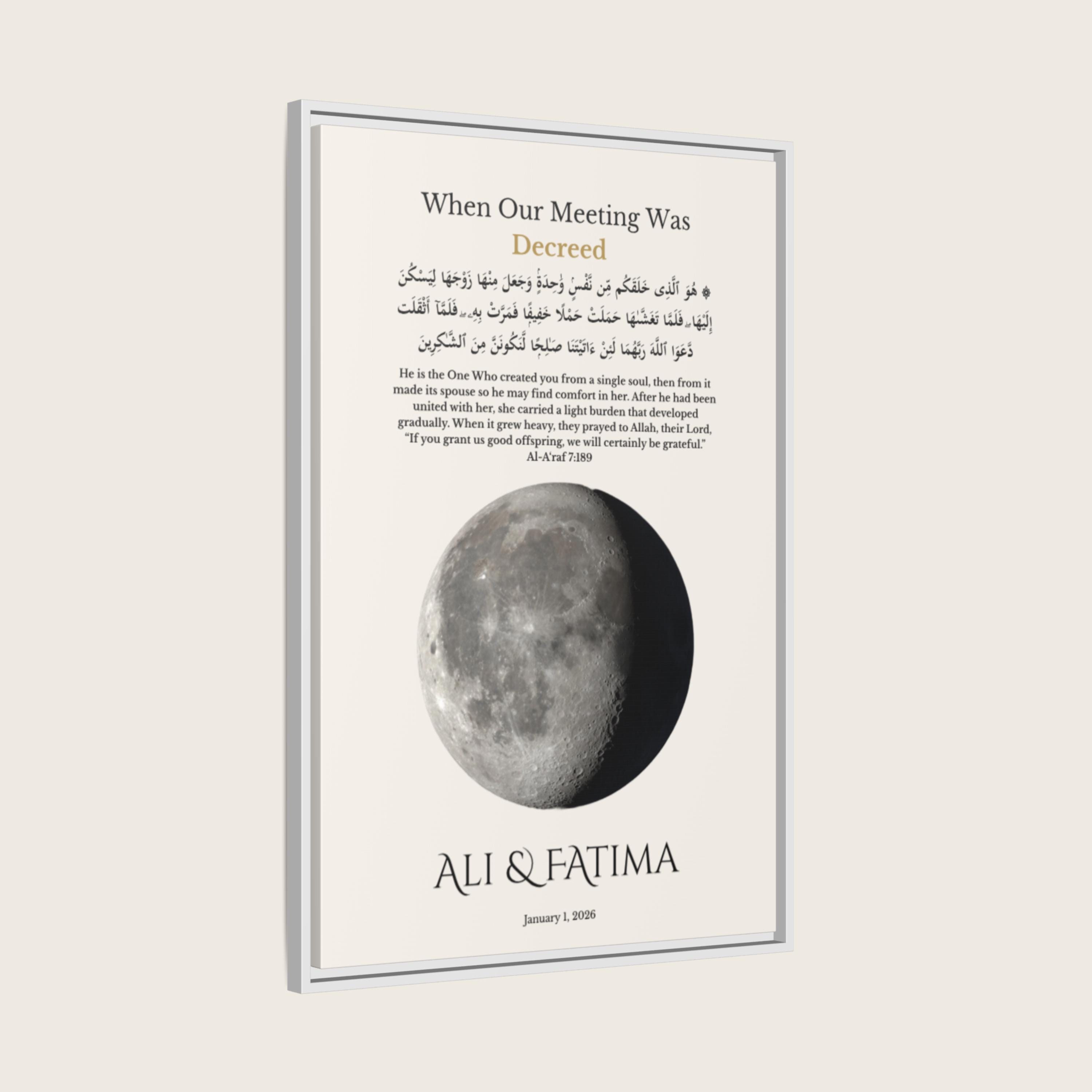 This meaningful wall art is calculated using precise lunar data based on your selected date, reflecting the true moon phase on your first meeting. Personalized with your names and first date, it features a Qur’an verse from Surah Al-A’raf (7:189) in Arabic and English — honoring the belief that your meeting was written long before it happened.